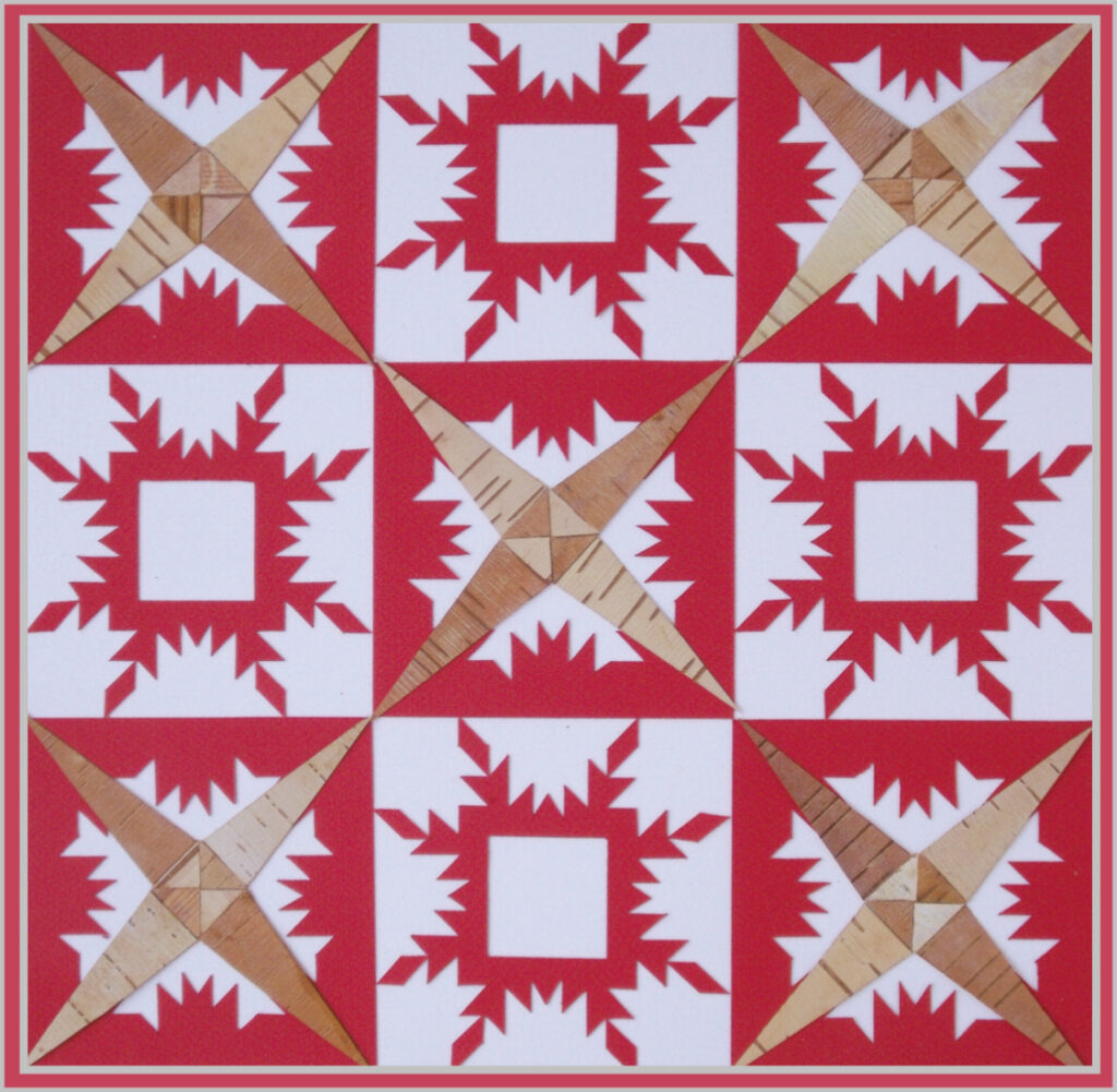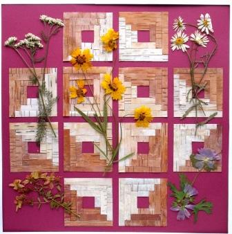 Catharine Parr Traill, who settled near Peterbrough, was a skilled amateur botanist, who wrote books about native plants and whose dried specimens, mounted on birchbark, are today in the National Archives in Ottawa. The Log cabin quilt block, here using the dark and light sides of birchbark, surrounding a warm hearth, was popular thoughout the nineteenth century.