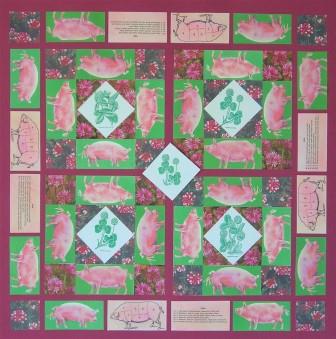 Anne Langton travelled from England to join her brother’s family on Sturgeon Lake. Well educated and a talented artist, she found herself dealing with new challenges in the kitchen, often to do with pigs. Pigs in Clover, a nine patch, combines pigs with nineteenth century recipes, and images of clover from contemporary seed cataloqgues.